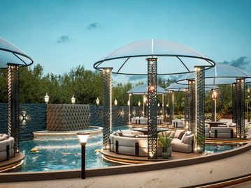 The gazebo seating arrangement is perfect for those looking to enjoy their meals in a semi-private and aesthetically pleasing environment. Each gazebo is designed to accommodate families or groups, featuring elegant interiors and soft lighting for a cozy atmosphere. Surrounded by lush greenery and adorned with fairy lights, the gazebos create a romantic and tranquil setting, especially in the evening.